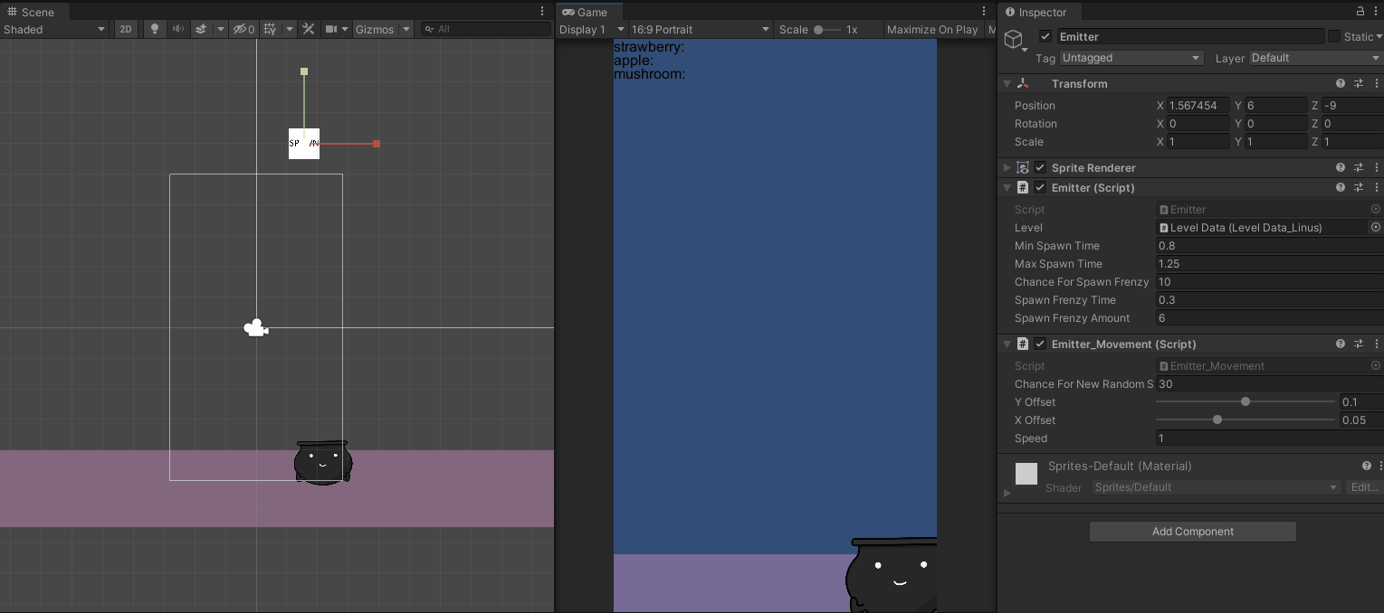 I wanted the game to sway more towards satisfying and addicting, rather than hectic and difficult. One way to achieve this goal was to make the spawning quite predictable - it followed a pattern and the ingredients were falling slowly.